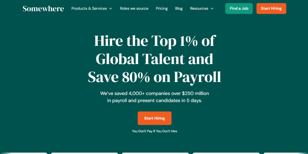 Somewhere is a great pick if you’re hiring remote executive assistants specifically. Their platform is built around sourcing international, full‑time remote hires with strong English communication and administrative skill sets, often at a fraction of U.S. payroll costs.